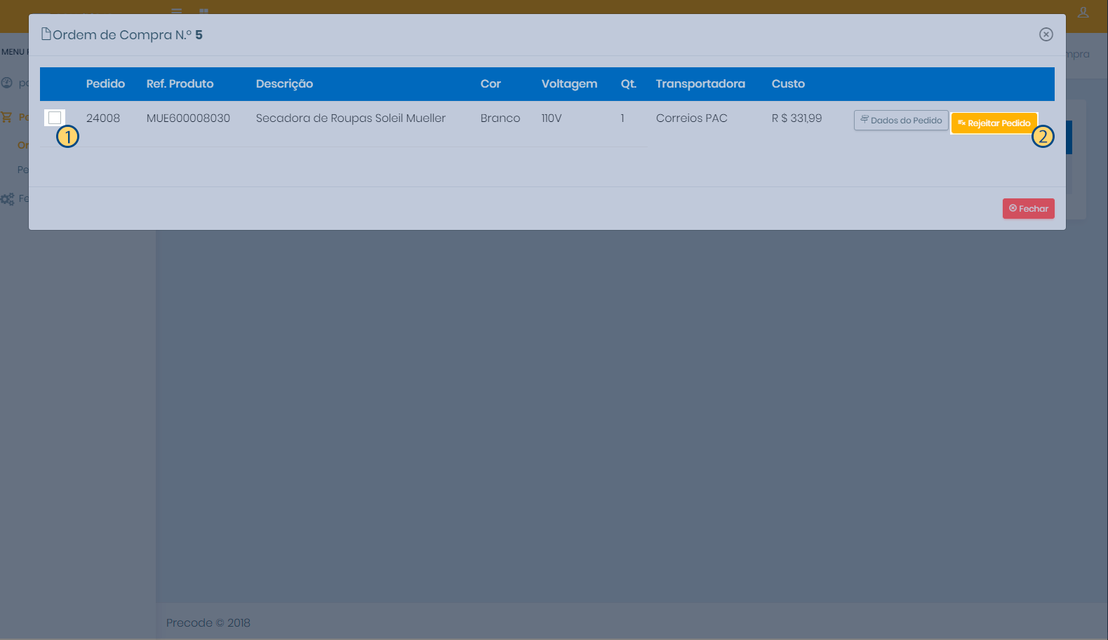 Na ordem de compra conterá o número do pedido, cor, voltagem, descrição, referência, quantidade, qual transportadora fara a entrega e o preço que foi negociado entre a sua loja e o fornecedor.