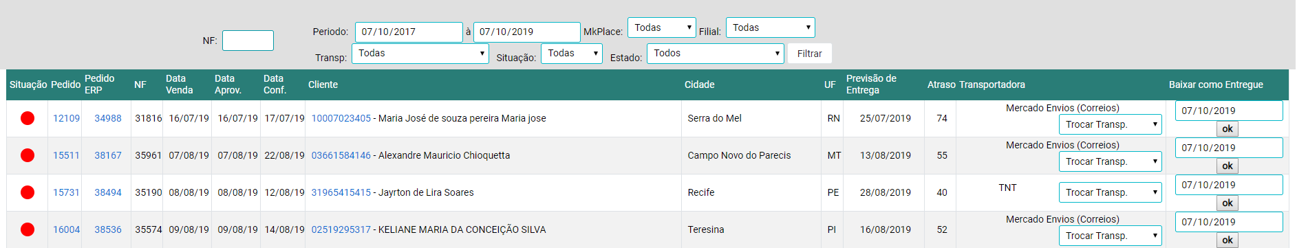 Assim que selecionado as datas, iremos ver todas as notas emitidas nesse período para acompanhar as entregas.
