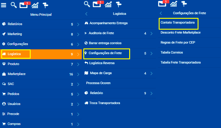 Para se ter acesso a tela de contato transportadora é necessário seguir os seguintes passos: