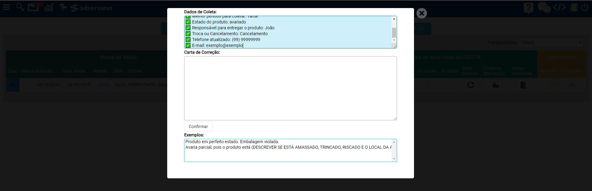 Assim que recebida a confirmação de coleta por parte da transportadora, ao clicar no botão “ok” o pedido terá seu status alterado para “retornando”.